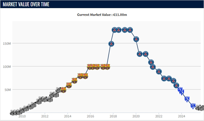 开云体育网址-内马尔身价跌至1100万欧元,33岁远逊同期梅罗亿万估值