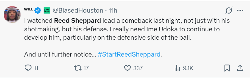 休媒:其实选择很简单,既然火箭用探花签选了谢泼德,就不要用那些G联赛的后卫,就让谢泼德打就好了。